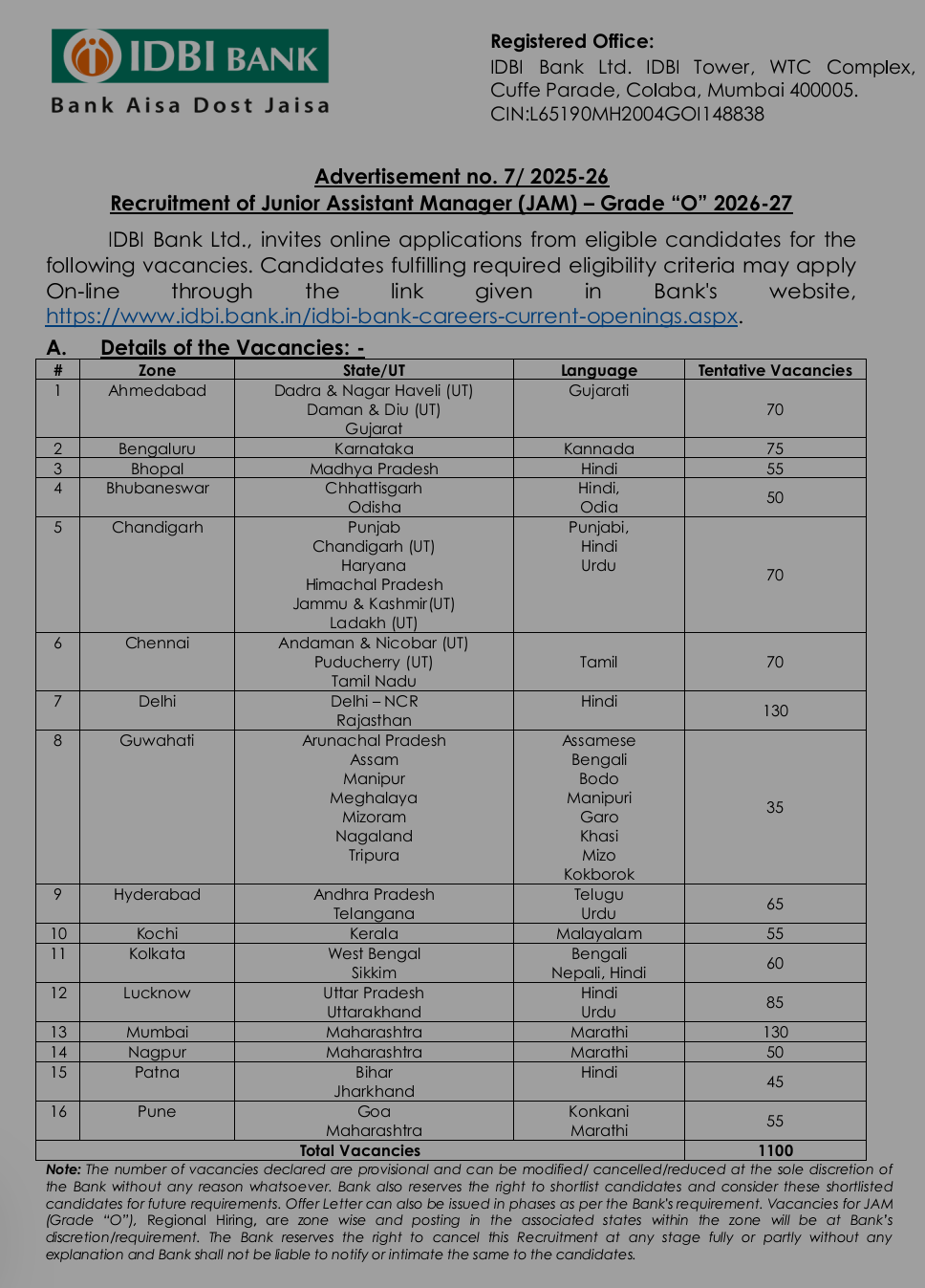 IDBI Bank JAM Vacancy 2026 Posting Related Important Points :