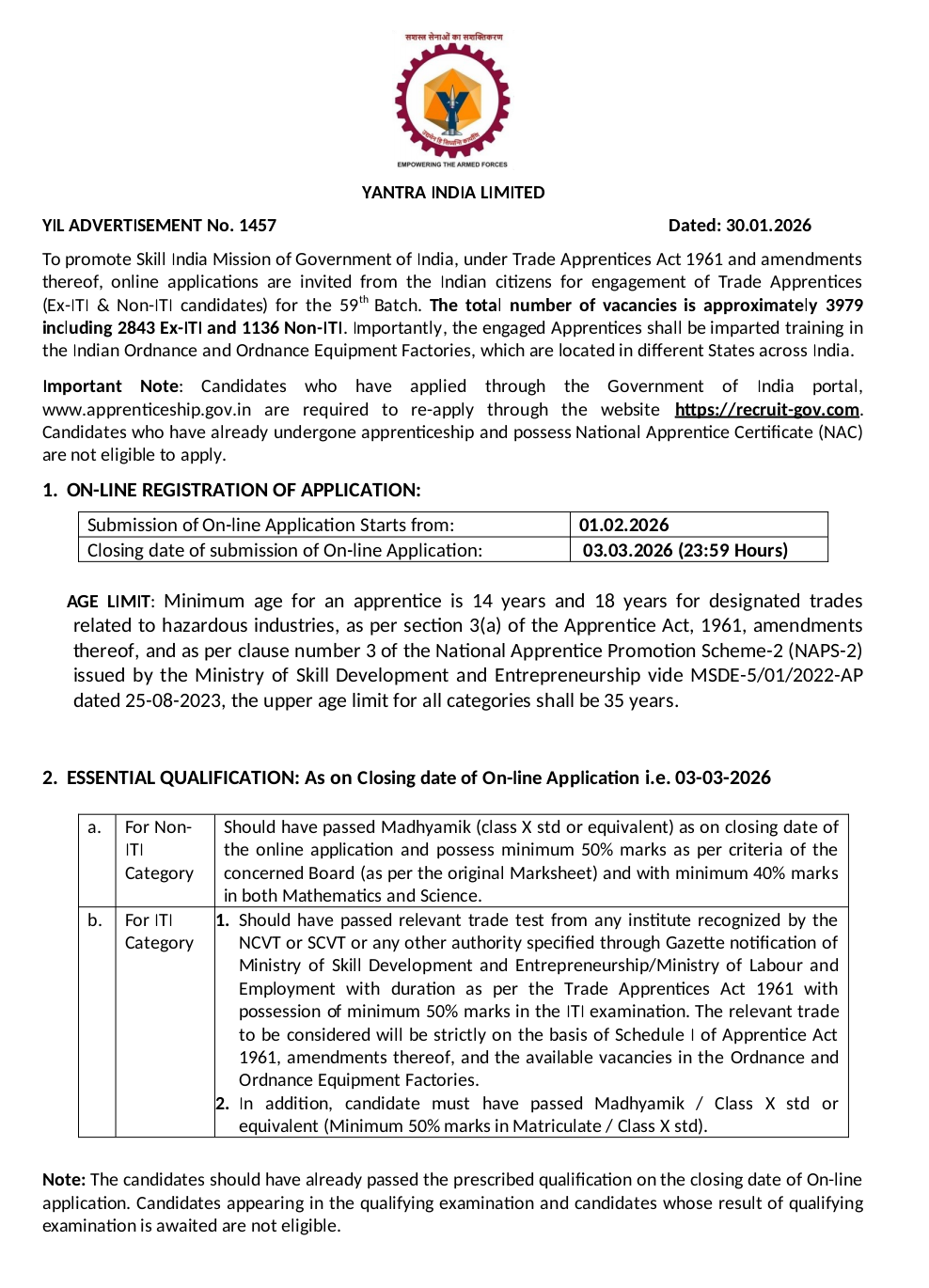 Yantra India Limited Vacancy 2026 | 3979 Posts YIL Recruitment Apply Online – Full Notification